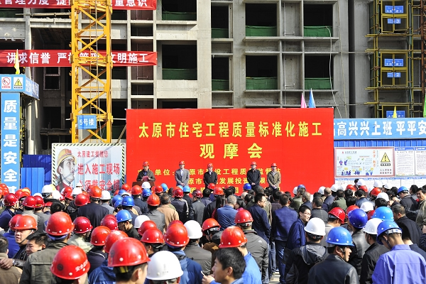 2015年4月3日上午,為貫徹落實(shí)建設(shè)部全國工程質(zhì)量治理兩年行動電視電話會議和山西省住建廳、太原市住建委工程質(zhì)量治理兩年行動推進(jìn)會議精神,進(jìn)一步規(guī)范全市建筑質(zhì)量標(biāo)準(zhǔn)化施工,保障住宅工程質(zhì)量。由太原市建設(shè)工程質(zhì)量監(jiān)督站、太原市龍城發(fā)展投資有限公司主辦,太原建工集團(tuán)有限公司承辦的“太原市住宅工程質(zhì)量標(biāo)準(zhǔn)化施工觀摩會”在我公司承建的“太原市府東街東延棚戶區(qū)改造安置用房項目”現(xiàn)場舉行。